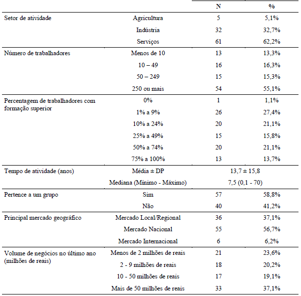 O tempo médio de atividade das empresas incluídas no estudo é 13,7 ± 15,8 anos, variando entre 1 mês e 70 anos. Em termos de estrutura empresarial, 58,8% das empresas pertencem a um grupo empresarial, dos quais 91,2% são grupos brasileiros e os demais grupos têm origem em países como os Estados Unidos, Alemanha, Grã-Bretanha e Chile. Os principais mercados dos bens ou serviços vendidos pelas empresas da amostra são os mercados nacional (56,7%) e local/regional (37,1%). No que respeita ao volume de negócios no último ano, constata-se que 37,1% das empresas faturaram mais de 50 milhões de reais, 19,1% faturaram entre 10 e 50 milhões de reais, 20,2% tiveram um volume de negócios entre 2 e 9 milhões de reais e em 23,6% das empresas este foi inferior a 2 milhões de reais (Tabela 3).