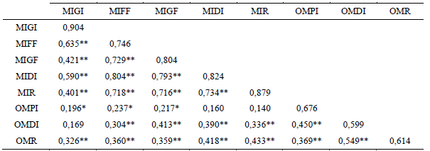 MIGI – Orientação para o mercado interno: Geração de informação informal; MIFF – Orientação para o mercado interno: Geração de informação formal face-to-face; MIGF – Orientação para o mercado interno: Geração de informação formal escrita; MIDI – Orientação para o mercado interno: Divulgação de informação; MIR – Orientação para o mercado interno: Implementação de respostas; OMPI – Orientação para o mercado: Produção de informação; OMDI – Orientação para o mercado: Divulgação de informação; OMR – Orientação para o mercado: Resposta. Fonte: adaptado de Lings, I. N., & Greenley, G. E. (2010). Internal market orientation and market-oriented behaviours. Journal of Service Management, 21(3), 321-343. doi: 10.1108/09564231011050788