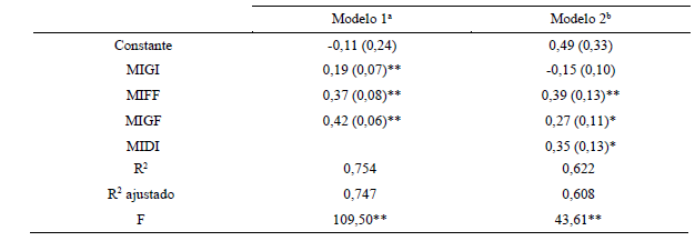Para a validação das hipóteses, foram estimados modelos de regressão linear múltipla, estimados pelo método dos mínimos quadrados. A Tabela 5 apresenta os resultados relativos às hipóteses em que intervêm as dimensões da Orientação para o mercado interno. Foram estimados dois modelos de regressão (Modelo 1 e Modelo 2), tendo o primeiro o objetivo de avaliar as hipóteses H1a, H1b e H1c, e o segundo, avaliar as hipóteses H1d, H1e, H1f e H1g.
