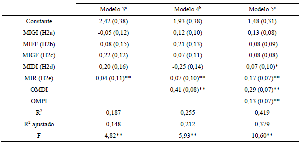 Relativamente ao impacto das dimensões da Orientação para o mercado interno sobre as dimensões da Orientação para o mercado (H2a, H2b, H2c, H2d e H2e), e às relações causais das dimensões da Orientação para o mercado (H3a, H3b e H3c), foram estimados três modelos de regressão (Modelo 3, Modelo 4 e Modelo 5) (Tabela 6).