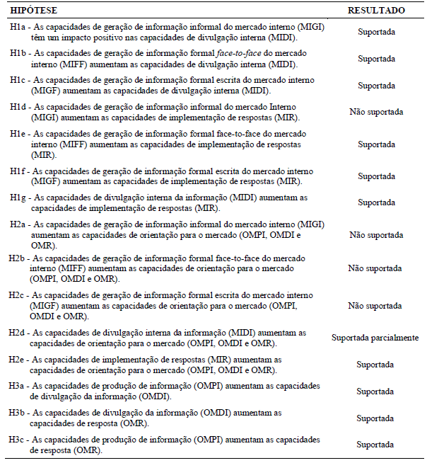 Estes resultados permitiram suportar as hipóteses: H1a; H1b; H1c; H1e, H1f e H1g. São assim suportadas as hipóteses segundo as quais as capacidades de geração de informação informal (MIGI), formal face-to-face (MIFF) e escrita (MIGF) sobre o mercado interno têm um impacto positivo estatisticamente significativo sobre as capacidades de divulgação interna da informação (MIDI). Para além disso, as capacidades de geração de informação formal face-to-face (MIFF), informação formal escrita (MIGF) e divulgação de informação (MIDI) sobre o mercado interno aumentam significativamente as capacidades de implementação de respostas (MIR). A Hipótese H1d, que propunha que as capacidades de geração de informação informal afetavam as capacidades de implementação de respostas, não foi suportada. Estes resultados corroboram parcialmente os resultados de Lings e Greenley (2010) e de Jaworski e Kohli (1993), constatando-se que a geração no mercado interno de informação afeta a divulgação dessas mesmas informações, sendo também possível atestar que a disseminação de informação afeta a implementação de respostas de valor para o mercado interno.