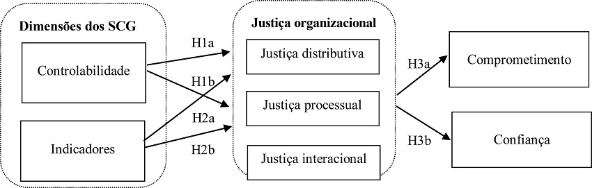 O pressuposto é que a justiça percebida nas dimensões (controlabilidade e múltiplos indicadores de desempenho) dos SCG (Langevin & Mendoza, 2013) atua em dois níveis: (a) afeta a relação entre o empregado e a organização como um todo (comprometimento organizacional) (Mowday, Steers, & Porter, 1979); e (b) influencia suas relações com seus superiores (confiança no supervisor) (Whitener, Brodt, Korsgaard, & Werner, 1998). Ambos levam à maior congruência entre os objetivos organizacionais e pessoais e, consequentemente, diminuem possíveis reações em relação à injustiça percebida.