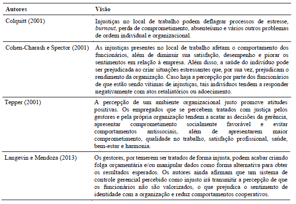 Pesquisas relativas à justiça organizacional têm ampliado o conhecimento sobre as diferentes formas de reações às injustiças percebidas e sobre os processos que deflagram comportamentos decorrentes. O estudo de Langevin e Mendoza (2013) aponta que os Sistemas de Controle Gerencial (SCG), quando considerados injustos, podem levar os gestores a terem comportamentos prejudiciais à empresa. Os autores advertem que ao invés de motivar, em algumas situações os SCG podem não contribuir à consecução dos objetivos da empresa e, dessa forma, diminuir o desempenho organizacional e a remuneração variável.