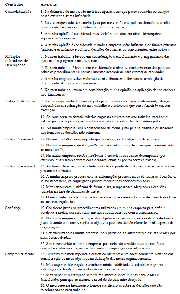 Observa-se na Tabela 2 que, para cada construto, foram formuladas assertivas, em relação às quais se solicitou aos gestores que indicassem o seu grau de concordância com cada frase em uma escala de sete pontos, sendo: 1 = discordo totalmente; 2 = discordo moderadamente; 3 = discordo ligeiramente; 4 = não concordo nem discordo; 5 = concordo ligeiramente; 6 = concordo moderadamente; 7 = concordo totalmente.