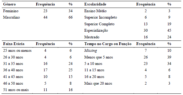 Os resultados demográficos apresentados sugerem que os respondentes reúnem as condições necessárias para responder o instrumento de pesquisa, em especial considerando-se o seu nível de escolaridade formal.