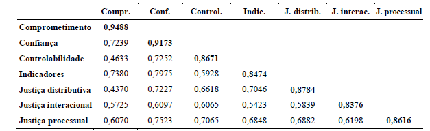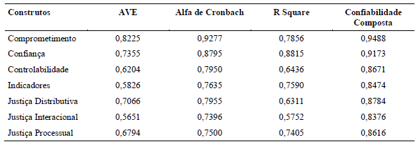 De acordo com a Tabela 4, os resultados do alfa de Cronbach foram superiores a 0,70, demonstrando um grau de fidelidade aceitável (Hair et al., 2005). Portanto, aceitam-se os indicadores para cada construto, sendo que a menor carga foi de 0,7396 para justiça interacional. Esse resultado condiz com os estudos de Colquitt (2001) na validação do modelo conceitual de justiça organizacional, composto de três fatores (justiça distributiva, processual e interacional). O modelo de três fatores é a conceituação mais comumente usada para avaliar a justiça organizacional, o qual também foi validado por Aryee, Budhwar e Chen (2002).