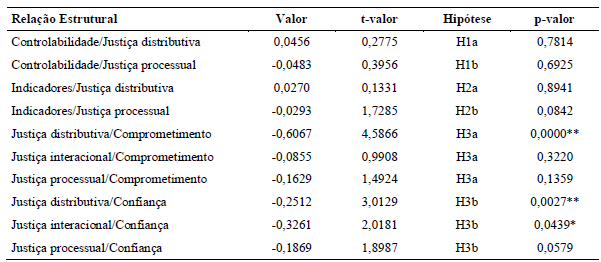 Observa-se, na Tabela 6, que apenas a relação entre as variáveis latentes justiça distributiva e comprometimento, justiça distributiva e confiança, justiça interacional e confiança apresentaram valores acima de 1,96 para os coeficientes de caminho.