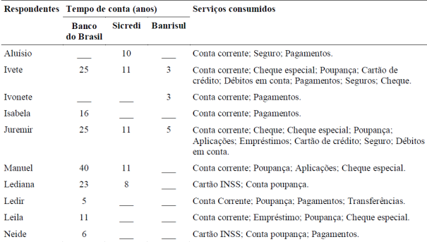 Em virtude da aposentadoria, todos os entrevistados possuem conta bancária. Contudo, é interessante observar a existência de dois grupos distintos: (a) aqueles que eram consumidores de serviços bancários antes da aposentadoria e expressam uma percepção de maior capacidade de agência por experiências passadas; e (b) aqueles que passaram a ser consumidores em virtude da necessidade de receber os proventos da aposentadoria. Essa distinção fica clara na fala da entrevistada Lediana, que pertence ao segundo grupo: "senti a necessidade de abrir uma conta para receber a minha aposentadoria e a pensão do meu esposo...; precisava também de uma conta para guardar o dinheiro que sobrava" (Lediana). Em contraponto, o entrevistado Manuel, pertencente ao primeiro grupo, possui conta bancária há 40 anos: "a primeira conta que abri foi porque precisava de um financiamento. Como eu tinha bastantes terras, precisava comprar máquinas e comprar gado, pois também criava gado pra vender" (Manuel).