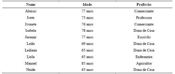 A seleção dos entrevistados ocorreu por meio da técnica bola-de-neve, na qual cada entrevistado indicava dois possíveis entrevistados, ou seja, um processo que envolve ondas sucessivas de seleção de entrevistados a partir dos próprios entrevistados (Malhotra, 2011). A coleta dos dados foi encerrada a partir da observação da saturação dos dados (Glaser & Strauss, 1967), quando se suspendeu a inclusão de novos participantes na pesquisa, em virtude da redundância e repetição nos dados obtidos. No total, foram conduzidas 10 entrevistas. Dos entrevistados, três são homens e sete são mulheres. Todos os participantes viveram a maior parte de sua vida em Progresso. São aposentados, predominantemente pertencentes à classe média e moram com filhos, com cônjuges ou sozinhos. A Tabela 1 descreve cada um deles com sua respectiva idade e profissão que exerciam antes da aposentadoria. Ressalta-se que, para garantir a confidencialidade, os nomes dos entrevistados foram alterados.