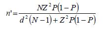 Equação utilizada, ver em https://www.kck.usm.my/ppsg/.../SSCPSversion1001.xls. Onde: n' = amostra com população finita; N = tamanho da população; Z = estatística para nível de confiança; P = proporção esperada; d = precisão.