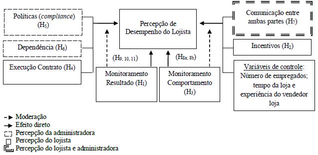 Caixas pontilhadas denotam a uma autoavaliação do lojista; caixas contínuas correspondem a uma avaliação dele para com a administradora; caixa com linha dupla salienta uma avaliação de ambas as partes; efeitos moderadores são as relações pontilhadas.