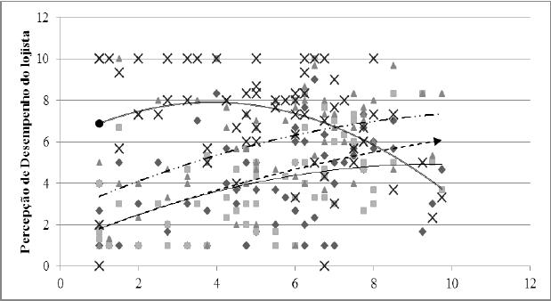 Observa-se que algumas suposições do framework teórico foram confirmadas parcialmente ao nível de 10%, e outras não. Diante disso, é importante examinar novos caminhos e buscar tentativas de explicações para verificar os resultados. Objetivando uma análise mais detalhada do efeito da dependência sobre o desempenho, elaborou-se uma equação quadrática e uma nova regressão foi estimada (ver SPSS® análise de regressão curve estimation). A equação quadrática é, antes de tudo, um polinômio do segundo grau, isto é, tem como termo de maior grau (valor do expoente mais alto) um termo de expoente dois (Apêndice B). Diante desse objetivo, o modelo teórico foi estimado novamente com todas as variáveis quadráticas. Os resultados mostraram uma nova lente para verificar que o desempenho do lojista também é visto pela perspectiva curvilinear em forma de U-invertido. A Tabela 2 apresenta os coeficientes, e a Figura 2 demonstra as curvas.