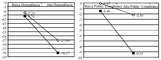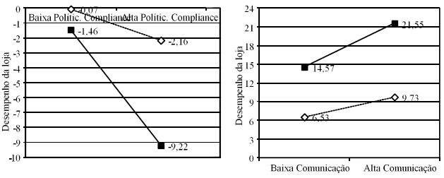 Houve um efeito moderador da dependência × monitoramento por resultado sobre o desempenho (Y = βmonitoramento por resultado = 0,09 + βdependência = -0,21 + βmonitoramento por resultado × dependência = -0,56; R2 = 31%). Como a percepção de ambas as variáveis são negativas, a interação prejudicou o desempenho, suportando a H10. Os achados mostraram que quando há monitoramento, a percepção do desempenho do lojista fica ainda mais prejudicada. Ademais, a relação é mais negativa com os maiores níveis de monitoramento por resultado (Figura 3, lado esquerdo). Notou-se também um efeito moderador negativo da política de compliance × monitoramento por comportamento sobre o desempenho (Y = β monitoramento por comportamento = 0,16 + βcompliance = -0,42 + βmonitoramento por comportamento × compliance = -0,25; R2 = 37%). Os achados mostraram que quando há o processo de monitoramento por comportamento, há menor percepção de desempenho do lojista, dado a política de compliance. Esse resultado é contrário ao esperado, pois o efeito foi negativo, rejeitando a H9 (Figura 3, lado direito).