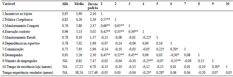O alfa de Cronbach mostrou confiabilidade das escalas de medida. A matriz de correlação (Tabela 1) evidenciou algumas variáveis chaves para explicar o desempenho do lojista, sendo: incentivos recebidos (r = 0,45; p<0,01) e políticas de compliance (r = 0,52; p<0,01).