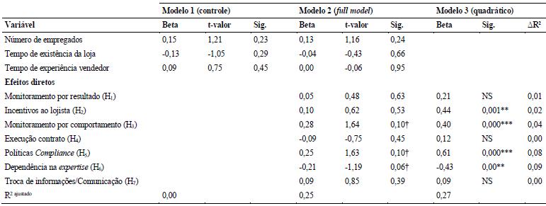 De acordo com a Tabela 2, as variáveis de controle da loja não tiveram relação com o desempenho. A variância explicada foi nula (R2 ajustado = 0,00). Os resultados mostraram que a quantidade de empregados (B=0,15; p=NS), tempo de existência da loja (B = -0,13; p=NS) e tempo de experiência do vendedor (B=0,09; p=NS) não tiveram relação com o desempenho.