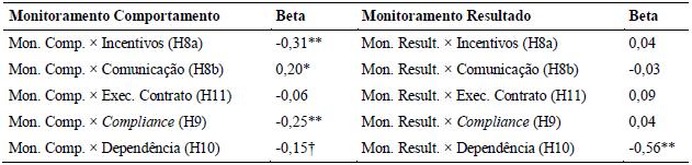 Por fim, suportou-se a H8b do papel moderador do monitoramento × comunicação sobre o desempenho (Y = βmonitoramento por comportamento = 0,48 + βcomunicação = 0,12 + βmonitoramento por comportamento × comunicação = 0,20; R2 = 32%; Figura 4, lado direito). Os achados mostraram que quando há o processo de monitoramento por comportamento, há ainda mais políticas de comunicação entre administradora e loja. Vale salientar que a hipótese H8a de incentivos foi rejeitada, uma vez que foi na direção contrária (β = - 0,31).