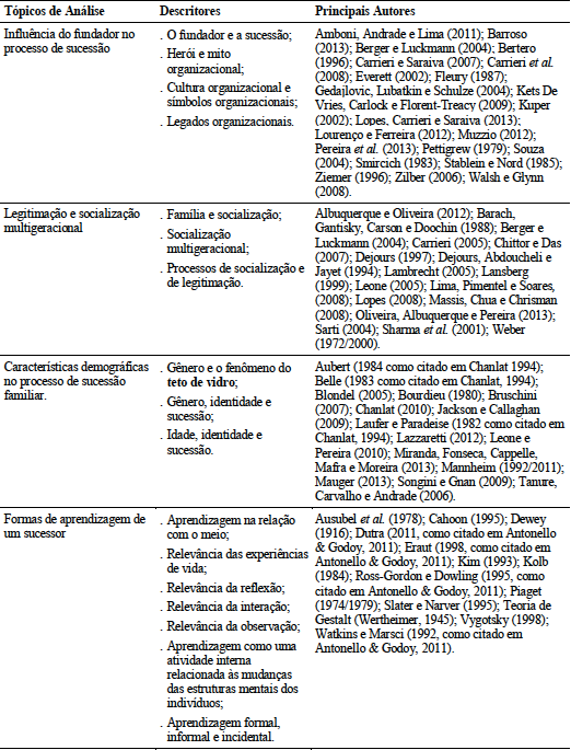 Com base nesta revisão de literatura e com o objetivo de nortear a construção dos instrumentos de pesquisa e da análise, foram construídos tópicos de análise e os seus respectivos descritores (Tabela 1), uma vez que análises orientadas por categorias teoricamente fundamentadas oferecem qualidade ao trabalho (Yin, 2010).