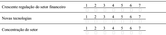 1. Tendo em vista as principais mudanças em relação ao sistema financeiro mundial e, em especial, o cenário dos bancos comerciais brasileiros, atribua uma nota de 1 (pouca influência) a 7 (grande influência) aos seguintes fatores de configuração do ambiente dos bancos brasileiros que atuam no negócio de pessoas físicas e jurídicas para os próximos 10 anos. Em seguida, comente cada um desses três fatores*.