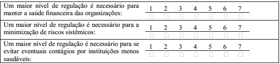 1. Em relação às questões abaixo sobre regulação, manifeste seu grau de concordância segundo a escala a seguir: 1 (discordo plenamente) a 7 (concordo plenamente)*: