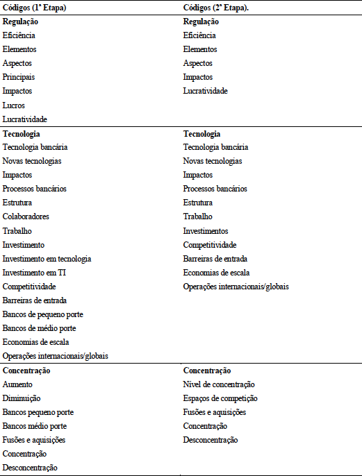A proposta desta pesquisa seria construir um entendimento sobre elementos de competitividade de bancos comerciais no Brasil, levando-se em consideração variáveis de configuração do seu ambiente competitivo. Para a coleta de dados, foram utilizados um roteiro de entrevistas e um painel Delphi complementar, ambos realizados simultaneamente entre janeiro e agosto de 2013. Para a organização e análise dos dados das entrevistas, utilizou-se o software NVIVO 9; já os dados relativos ao painel Delphi, oriundos de questões objetivas, foram resumidos em tabelas. A estruturação dos instrumentos de coleta teve como base conceitual os temas da Estratégia Competitiva: arena de competição, delimitação de competidores e forças externas. Após o alinhamento teórico, os instrumentos foram avaliados e refinados por dois acadêmicos e especialistas no setor. Depois da primeira verificação, foi realizado um pré-teste com um dos respondentes, cujas críticas serviram para aperfeiçoá-lo. Para a condução da análise de conteúdo, foram utilizadas as seguintes etapas procedimentais: (a) condução das entrevistas, (b) transcrição das entrevistas, (c) inserção das transcrições no software, (d) busca por palavras-chave e levantamento iterativo de frequência de palavras, (e) seleção e agrupamento em códigos e (f) análise e síntese dos códigos. A definição dos códigos se deu em duas etapas; tal flexibilidade é prevista de acordo com Lewins e Silver (2008), sendo útil para um adequado refinamento das unidades de análise; no entanto, foi utilizada uma abordagem dedutiva, em que a combinação dos códigos obedece a uma estrutura pré-definida. Os códigos gerados a partir da análise de conteúdo podem ser verificados na Tabela 1.