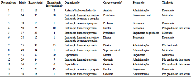 Dois grupos específicos de respondentes foram contemplados: executivos e ex-executivos de bancos com carteira comercial e especialistas do setor (acadêmicos e consultores). A escolha dos respondentes para o Painel Delphi baseou-se em quatro critérios: tempo de experiência profissional do respondente relacionado ao setor; complexidade das tarefas/posição estratégica que ocupa ou tenha ocupado na organização; vivência internacional e formação acadêmica.