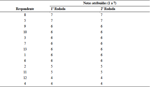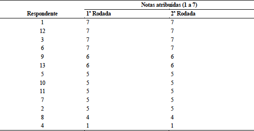 A primeira rodada do painel Delphi foi realizada entre fevereiro e maio de 2013, contando com a participação de treze respondentes (Tabela 2). A segunda rodada, a partir da qual lhes foram enviados os resultados preliminares, não sofreu nenhuma alteração, uma vez que todos mantiveram suas respostas iniciais.
