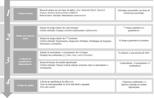 Dessa forma, faz-se necessária uma consolidação do entendimento sobre antecedentes e consequentes do comportamento materialista, conforme se apresentam nos diversos estudos da área de marketing. Nesse sentido, realizou-se uma revisão sistemática que proporcionou uma pesquisa meta-analítica. Essa última permitiu condensar os resultados das investigações no que tange aos antecedentes e aos consequentes do materialismo com referência ao comportamento de crianças e adolescentes, possibilitando a generalização do tema (Fern & Monroe, 1996). Como consequência, possibilitou o avanço desse conhecimento (Farley, Lehmann, & Sawyer, 1995), especialmente pelo fato de as conclusões obtidas através dessa metodologia permitirem definir padrões para o que é considerado estado da ciência, o que sabemos e o que não sabemos, e qual teoria é válida ou qual não é (Schmidt, 1996).