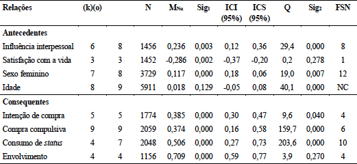 A análise de moderação foi aplicada para as seguintes situações: (a) quando a estatística Q, correspondente à heterogeneidade dos effect sizes, mostrava-se superior a 25% (Hunter & Schmidt, 2004); (b) quando o número de estudos era igual ou superior a nove, uma vez que números inferiores seriam insuficientes para notar alterações nos comportamentos por meio de moderadores (Hunter & Schmidt, 2004). Com base nessas justificativas, realizou-se o teste do efeito moderador somente para a relação entre comportamento materialista e compra compulsiva (consequente).