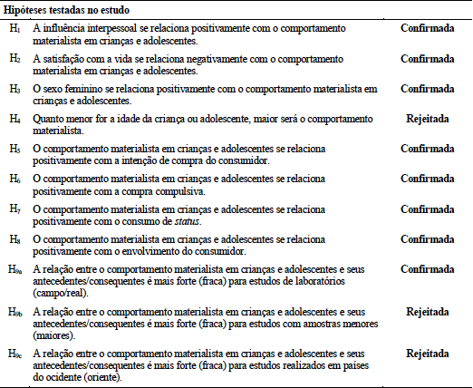 Observa-se que grande parte das relações diretas antecedentes foi confirmada (H1, H2 e H3), com exceção feita à relação entre idade e comportamento materialista (H4). No que tange aos consequentes, o materialismo foi significativo na sua relação com intenção de compra (H5), compra compulsiva (H6), consumo de status (H7) e envolvimento (H8). Por fim, encontra-se sustentação estatística para confirmar o efeito moderador do tipo de estudo, demonstrando que pesquisas aplicadas em laboratório tendem e produzir efeitos mais fortes do que pesquisas de campo (H9a) dentro das relações testadas.