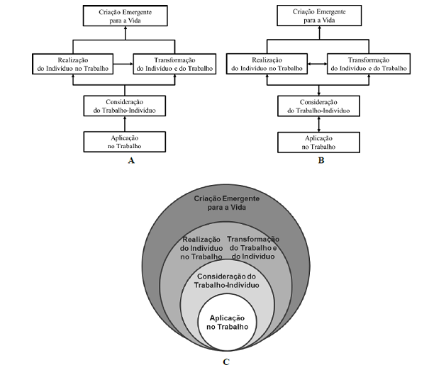 Ao final, os participantes do grupo de foco validaram o mapa do espaço de resultado em suas concepções inclusivas, hierárquicas e bidirecionais. Entretanto, ficaram muito incomodados com a figura na forma de organograma, e sugeriram que um caminho fluido e contínuo, que permitisse o trânsito de uma a outra categoria, devesse ser representado de outro modo. A imagem dos círculos inclusivos das categorias descritivas pareceu representar melhor, para eles, o mapa do espaço de resultado. Tal representação e contribuição proposta pelos participantes se encontra no modelo C da Figura 1. Nela, o mapa do espaço de resultado é visto como um continuum ininterrupto e inclusivo quando comparado ao mapa do espaço de resultado proposto pelos autores do método (modelo A da Figura 1) e autores da pesquisa (modelo B da Figura 1).