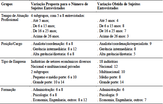 O método fenomenográfico preconiza a realização de vinte a trinta entrevistas em profundidade, semiestruturadas, planejando-se a amostra intencional para a busca de variedade nos sujeitos participantes, a fim de trazer os diferentes modos de experimentar o fenômeno (Akerlind, 2005a; Bowden & Green, 2005). No caso ora ilustrado, as entrevistas foram conduzidas com vinte e dois profissionais de RH, considerando a variação intencional: (a) por cargo, de analista a vice-presidente; (b) por tempo de experiência profissional, de 3 a 36 anos; (c) por tipo de empresa e porte, em vinte e duas empresas nacionais e multinacionais, privadas, de médio a grande porte; (d) por tipo de formação profissional. A Tabela 1 exibe a amostra planejada previamente à pesquisa e a efetivamente obtida.