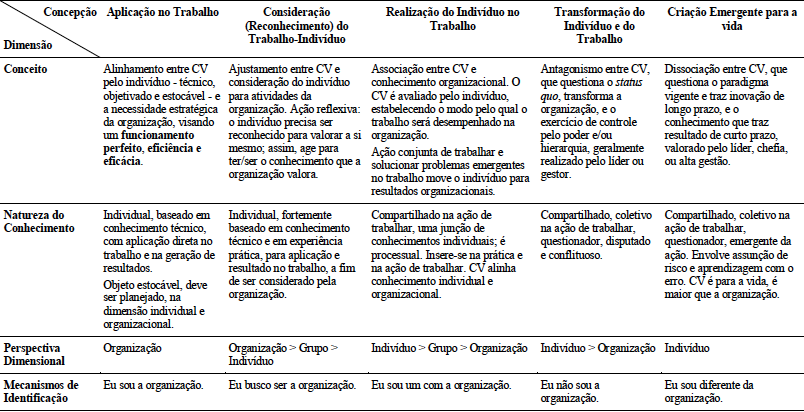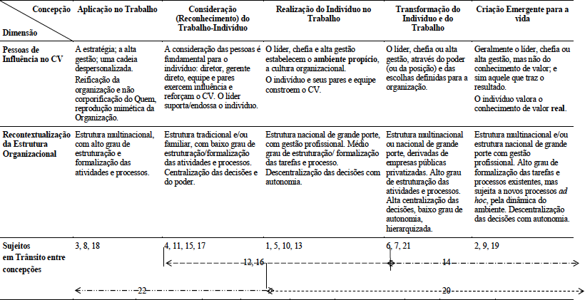 A análise das entrevistas em seu conjunto, para identificar as concepções emergentes e, individualmente, para salientar as dimensões componentes, fez emergir cinco concepções para descrever o fenômeno da valoração do conhecimento no contexto do trabalho. Essas categorias acerca da significação do Conhecimento Valorado (CV) foram arrumadas em ordem ascendente, hierárquica e inclusiva: a concepção seguinte incorporou os conceitos da categoria anterior e os expandiu na direção da ampliação da consciência dos indivíduos a respeito da experiência com o fenômeno. Foram elas:
