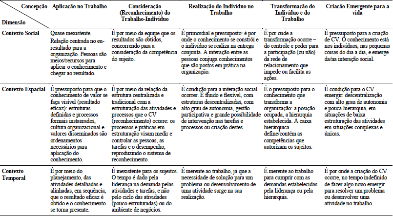 O espaço de resultado com as dimensões descritas encontra-se na Tabela 2 para fins de exemplificação do método fenomenográfico. As dimensões emergentes descritas na análise foram: a natureza do conhecimento; a perspectiva dimensional de interação social do indivíduo com os grupos e organização frente ao fenômeno; os mecanismos de identificação com a identidade organizacional; o contexto sócio-espaço-temporal; pessoas de influência frente à valoração do conhecimento; e recontextualização do arranjo estrutural organizacional encontrado em cada categoria, cujo somatório deu origem à concepção de valoração do conhecimento no contexto do trabalho.