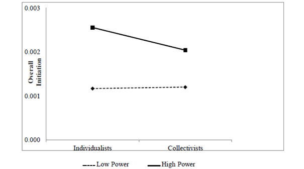 As reported in Model 2 of Table 2, the interaction of power and institutional collectivism practices had a significant effect on the intention to initiate negotiations, particularly with reference to the requesting (marginally significant) and optimizing phases. To visualize the interaction, we split the continuous scores for institutional collectivism practices based on their median to create meaningful categories (individualists and collectivists). We then plotted overall initiation for individualists vs. collectivists at low vs. high power. As shown in Figure 1, individualists, compared to collectivists, had a higher propensity to initiate negotiations, but only when relative bargaining power was high, consistent with Hypothesis 3.