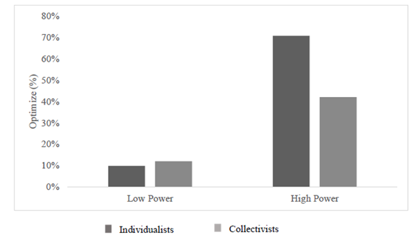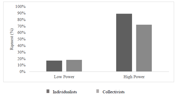 As noted, collectivists lean towards maintaining relational harmony, often to the point of avoiding any behaviors that might be viewed as self-oriented or socially awkward. In some cases, avoidance will extend beyond avoiding issues to eschewing encounters. Individualists, on the other hand, are more concerned with self, and generally more willing to employ distributive means to satisfy their self-interests. The recognition of power as a tool that might enhance an individualist's chances of achieving personal goals suggests that individualists with high relative bargaining power would be more willing than negotiators with low power to initiate a negotiation. In particular, we might expect individualists with power to not only make a request, but to optimize that request as well. Therefore,