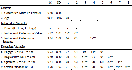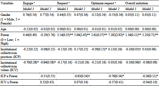 Because participants responded to two scenarios, each describing a different condition of bargaining power (low vs. high), we pooled the data and analyzed them in panel form, with the decision to initiate negotiations for each scenario as the unit of analysis. Therefore, the total number of observations was 244 (122 participants x 2 decisions). To examine the association of institutional collectivism to overall initiation we conducted a repeated measures multiple regression using a generalized estimating equations (GEE) approach (Liang & Zeger, 1986) in a two-stage model (the main effects followed by interaction terms), with overall initiation treated as a continuous variable. GEE is an extension of the general linear model which allows the analysis of dependent variables with non-normal distributions and corrects the estimates for potential within-subject correlation of errors (within subject variability) between repeated decisions (Ballinger, 2004). As a participant's decision in one scenario may affect the decision in the other, each set of repeated observations should deal with autocorrelation as a result of the dependence between decisions. Then, we considered the three binary dependent variables which pertain to the different phases of the initiation process (i.e., engaging, optimizing, requesting) as repeated observations of the same participant. For this reason, we analyzed the data using repeated measures logistic regressions complemented with a generalized estimating equations (GEE) approach for each phase of the initiation process, specifying an exchangeable correlation structure (i.e., observations clustered within respondents without considering order) in all sets of dependent variables. As gender (Bear, 2011; Bowles et al., 2007; Small et al., 2007) and age (Volkema & Fleck, 2012) had been found in previous studies to relate to initiation behavior, they were controlled for in this study.