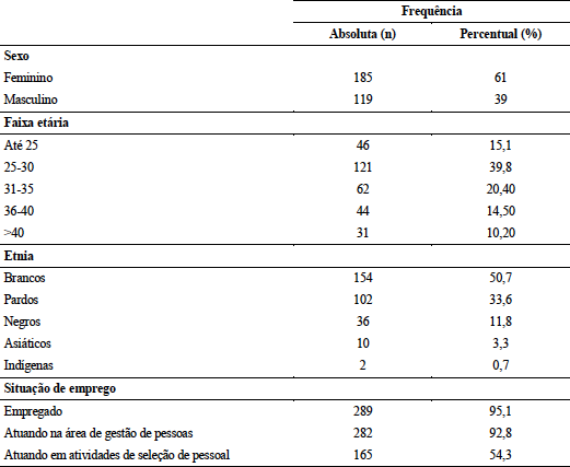 O estudo foi realizado com um grupo de 304 alunos e ex-alunos (185 mulheres e 119 homens) de um curso de MBA em Gestão de Pessoas de uma instituição de ensino superior sediada na cidade de São Paulo. Em média, a idade dos participantes era de 29 anos (desvio padrão = 2,82), variando entre as idades de 23 a 53 anos. Um total de 46 (15,1%) participantes tem até 25 anos, outros 121 (39,8%) estão na faixa etária entre 26 e 30 anos, 62 (20,4%) se classificaram entre 31 e 35 anos, 44 (14,5%) entre 36 e 40 anos e um total de 31 (10,2%) participantes possui mais que 40 anos. Em termos de etnia, a amostra apresentou a seguinte caracterização: 50,7% se declararam brancos (n=154); 33,6% pardos (n=102); 11,8% negros (n=36); 3,3% asiáticos (n=10); e 0,7% (n=2) se classificaram como de etnia indígena. A maioria dos participantes encontrava-se empregado no momento em que participaram da pesquisa (95,1%, n=289), já trabalharam na área de Gestão de Pessoas (92,8%, n=282), e diversos deles já desempenharam atividades de Seleção de Pessoal (54,3%, n=165). Os dados de caracterização da amostra se encontram sumarizados na Tabela 1.
