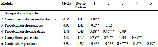 Todas as variáveis avaliadas no estudo foram operacionalizadas por meio de uma versão em português de escalas encontradas em Hosoda et al. (2012). As escalas passaram por um processo de tradução reversa para o português. A variável Cumprimento dos Requisitos do Cargo foi medida por meio de três itens (exemplo: Eu acho que ele serve para o cargo) em uma escala de 7 pontos cujas opções de resposta variaram de 1 (discordo fortemente) a 7 (concordo fortemente). Por sua vez, Probabilidade de Recebimento de Promoção foi medida por meio de uma escala de dois itens (exemplo: O potencial de que ele seja promovido nos próximos cinco anos é...) em uma escala de 7 pontos, que varia de 1 (muito baixo) a 7 (muito alta). Já Probabilidade de Contratação foi operacionalizada por meio do item - Você o contrataria para o cargo? - que foi pontuado como 1 para não e 2 para sim. As variáveis Competência Percebida e Cordialidade Percebida, que se referiam às características pessoais dos participantes, foram medidas por meio de escalas de 7 itens para cada. Nessas escalas, foram apresentados adjetivos antônimos (por exemplo: inteligente/não inteligente, confiante/não confiante e competente/incompetente para Competência Percebida; e cordial/frio, amigável/não amigável e honesto/desonesto para Cordialidade Percebida).
