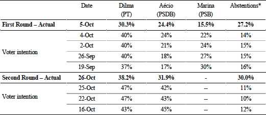 Given the empirical generalizations from the three most recent elections (Table 2) and the results from the first round of 2014 (Figure 1), it became clear that the final results would depend on what the 26 million voters who chose one of the eliminated candidates (Marina Silva in particular) in the first round would do in the second round. Would they abstain, vote for the winner or the runner-up?