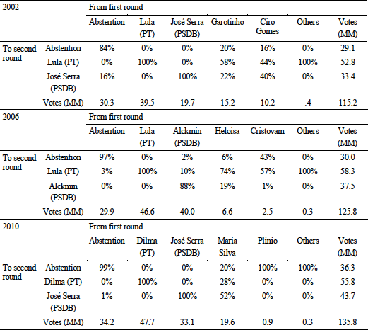 Across the three past elections, one can see that voters who abstained in the first round are unlikely to vote in the second; less than 5% of those abstaining in the first round are likely to vote in the final election. Virtually all those who voted for the winner in the first round support the same candidate in the second round. Voters who supported the runner-up tend to do the same, although some may switch to the winner, as seen in the 2006 elections. In all three presidential elections immediately prior to the most recent one (2002, 2006 and 2010), the victory margin in the first round was smaller than the votes obtained by the eliminated candidates.