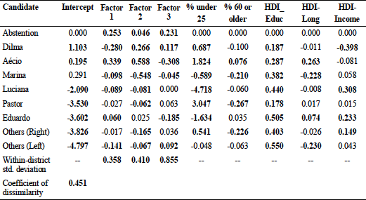 Table 3 presents the parameter estimates from the model, setting Abstention as the baseline for identification purposes, and grouping the 5 less-relevant candidates into Others (Left) and Others (Right) categories. As expected, abstentions tend to be higher when the HDI is lower, with only a few exceptions; preferences for Marina and Others(Left) tend to be lower than for abstentions in high-longevity districts; preferences for Dilma tend to be lower than abstentions in high-income districts. The standard deviations for the latent scores within districts are all smaller than those across districts (set to 1 for identification purposes), indicating that preferences are more diverse across districts than within each district, as one would expect.