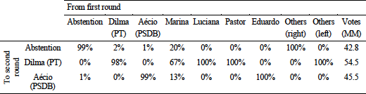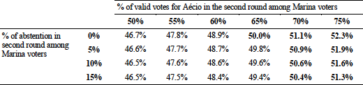 The simulation results shown in Table 5, combined with the evidence accumulated from the three previous presidential elections in Brazil, make it quite clear what Aécio Neves needed to win the final election. Past elections showed that voters tend to maintain the same option they chose in the first round, if it is still available (see Table 2). Therefore, in order to win, Aécio Neves needed to attract a large proportion of Marina Silva's votes. First, he needed to persuade these voters to come back to the polls (thereby competing against abstentions). Moreover, he needed to ensure these voters would transfer their preferences from Marina Silva to him.