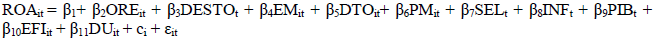 Têm-se como variáveis macroeconômicas: a taxa Selic (SEL), a inflação (INF) e o Produto Interno Bruto (PIB). Países que apresentam maiores instabilidades econômicas possuem inflação elevada e constante variação na taxa referencial e os efeitos sobre a rentabilidade são incertos. E, por ser balizadora das operações de crédito, a taxa Selic tem grande influência nas taxas cobradas pelos bancos, e a sua volatilidade (elevada para padrões internacionais) tem grande influência no grau de aversão ao risco (Oreiro, Paula, Silva, & Ono, 2006).