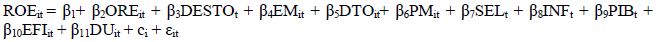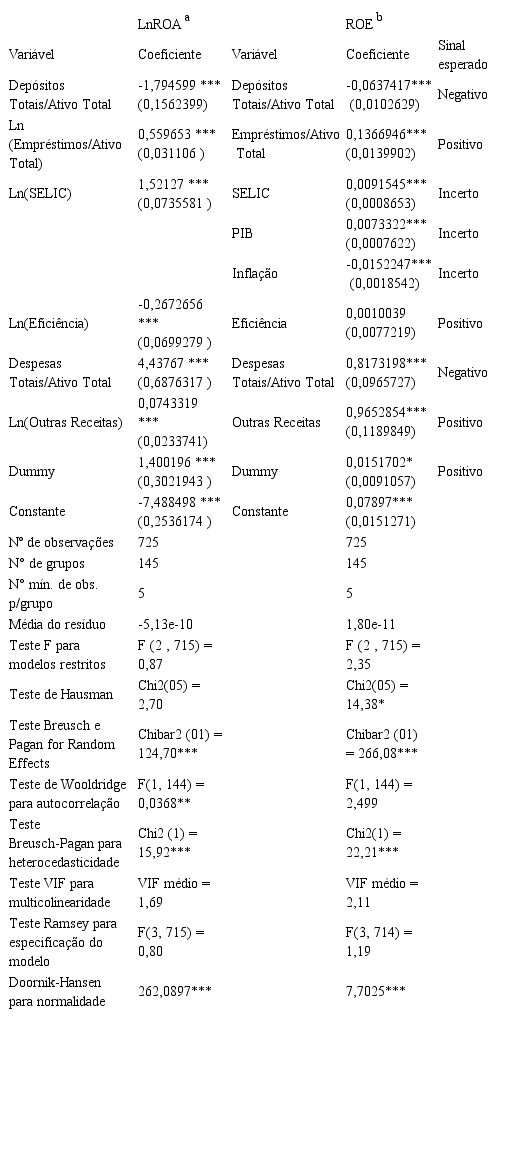 6. As variáveis ROA, EM, SELIC e EFI foram logaritmizadas no modelo 2 (ROE), para atender à especificação da forma funcional pelo teste de Ramsey Reset. Já o modelo 1 (ROA), com as variáveis em sua forma original, não rejeitou a hipótese nula do teste de Ramsey de especificação correta da forma funcional (Tabela 1).