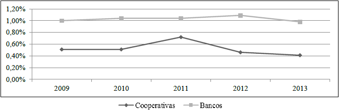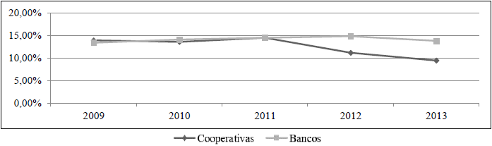 As cooperativas tiveram o indicador ROE superior aos dos bancos em 4,02% em 2009. Houve declínio nesse indicador por parte das cooperativas e melhora por parte dos bancos, revertendo a posição. Os bancos passaram a ter superioridade de 3,99% em 2010. Para o período de 2011, esses dois grupos de instituições tiveram resultados próximos, com uma diferença de 0,14% a favor dos bancos. Para 2012, os dois grupos apresentaram queda neste indicador, chegando a diferença a 32,97%, novamente favorável aos bancos, percentual que se ampliou para 46,28% em 2013.