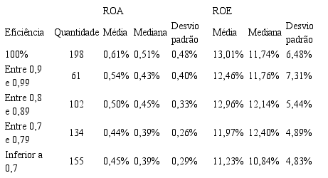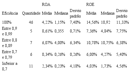 Com base nesses resultados, é possível inferir que, para o grupo de cooperativas pesquisadas, as instituições com eficiência de 100% apresentaram as maiores médias de rentabilidade mensuradas pelos indicadores ROA e ROE. Esses resultados são condizentes com as colocações de Thanassoulis (1999), Portela e Thanassoulis (2007) de que a maximização da eficiência promoveria o aumento da rentabilidade. Já para os bancos, os estudos divergem quanto a essas colocações.