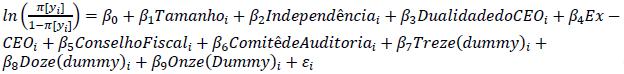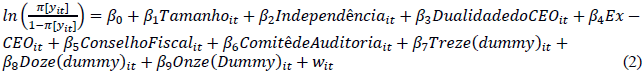onde, π[yit] representa a probabilidade das decisões do Conselho de Administração, i assumir dominância gerencial no tempo t; β0 representa o intercepto comum das empresas retiradas em uma amostra aleatória (diferenças dos interceptos individuais são refletidas no termo de erro); e wit é o termo de erro composto (erro específico dos indivíduos mais erro combinado da série de cortes transversais).