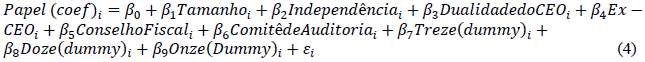 Nota-se, em todas as especificações, a persistência da relação positiva entre a presença do CEO anterior e a adoção do papel gerencial. A evidência da atuação do Conselho Fiscal nesse processo continua apresentando divergências: a Regressão Logística em Painel não demonstra esse efeito e as respostas obtidas com as diferentes especificações dos modelos pooled oscilam entre si, embora sigam fornecendo evidências de que essa relação, caso possa ser confirmada, é positiva.