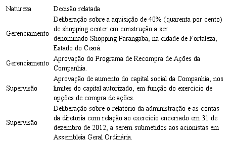 Esse resultado diverge dos achados de Schwartz-Ziv e Weisbach (2013), que, analisando 11 das 34 GBC israelenses, relataram uma proporção 2:1 de decisões de supervisão em relação às gerenciais, demonstrando, para aquela amostra, maior desigualdade em relação à quantidade de decisões que as empresas do Novo Mercado brasileiro.