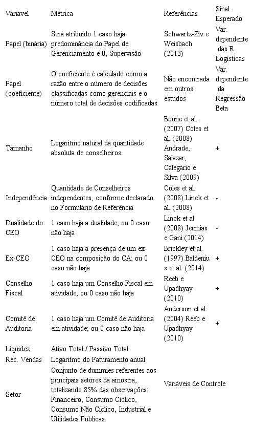 Para a proposição da avaliação dos determinantes, foi utilizado como variável dependente o Papel do Conselho, identificado a partir da Análise de Conteúdo. No que se refere às variáveis independentes, os estudos sobre Conselhos têm propostos três variáveis – Tamanho, Independência e Dualidade do CEO, havendo atenção secundária para os órgãos subordinados e para a presença de um ex-CEO no CA. A operacionalização das variáveis e a expectativa inicial estão expostas na Tabela 2.